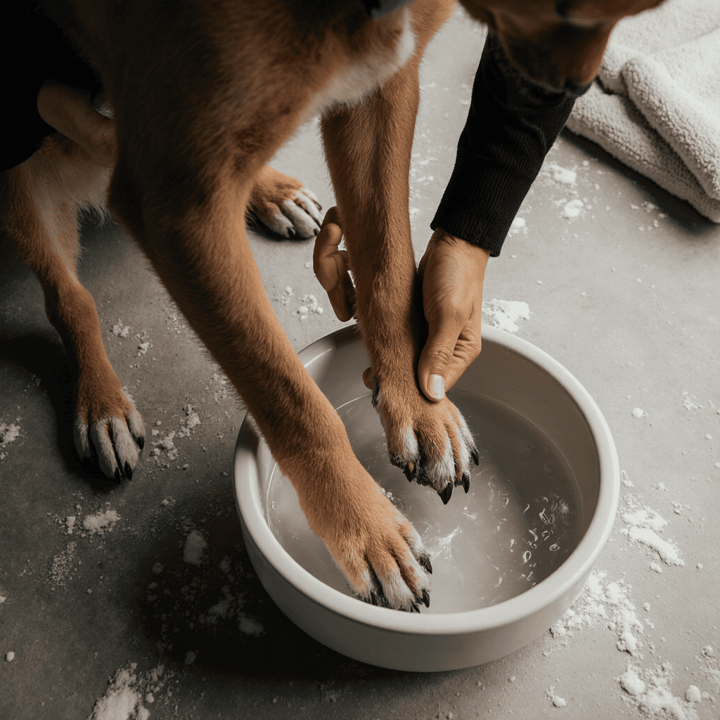 После каждой прогулки мойте только лапы, живот и область под хвостом тёплой водой без шампуня. Это удаляет реагенты и грязь, не подвергая собаку стрессу полного купания.