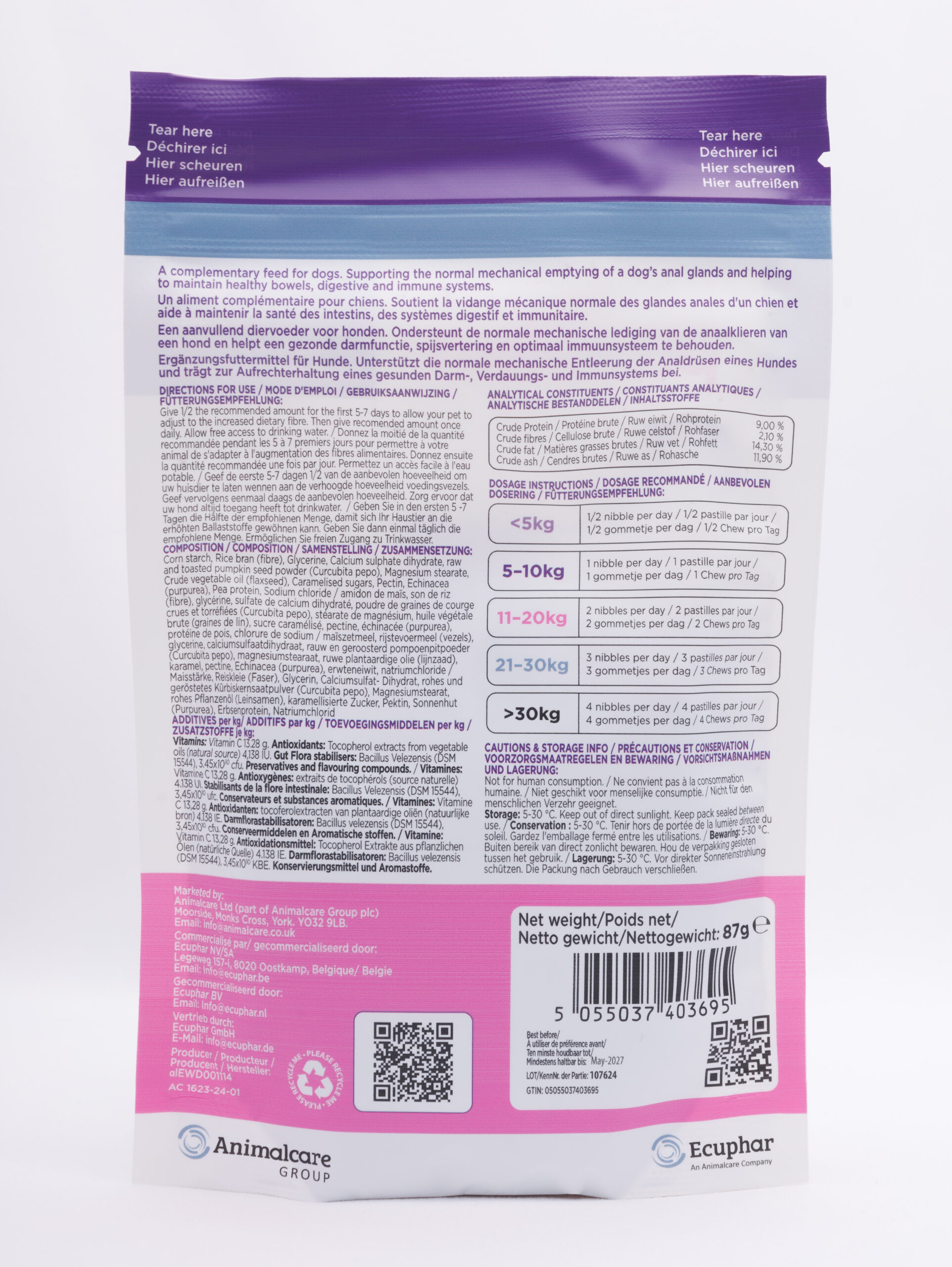 В течение первых 5–7 дней давайте собаке половину рекомендуемой дозы, чтобы она могла привыкнуть к повышенному содержанию клетчатки в рационе. Затем давайте рекомендуемую дозу один раз в день.  Всегда оставляйте воду в доступном месте. Если у вашей собаки опухли анальные железы, обратитесь к ветеринару.