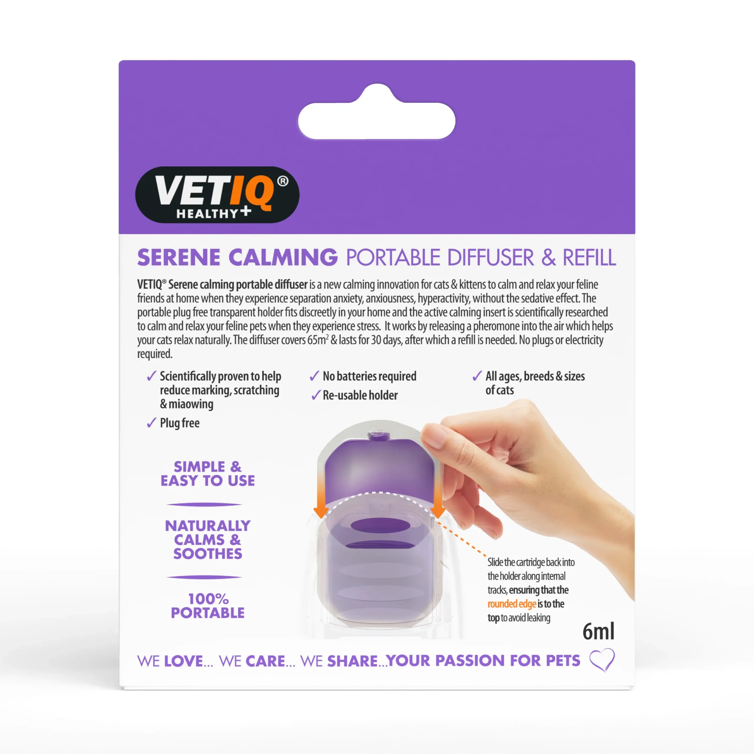 VETIQ Serene Calming Portable Diffuser Refill — инновационный портативный диффузор без подключения к электросети, предназначенный для снижения стресса у котят и кошек всех пород и возрастов. Он помогает питомцам чувствовать себя спокойнее при тревожности, гиперактивности и симптомах, связанных с разлукой, не вызывая седативного эффекта.
