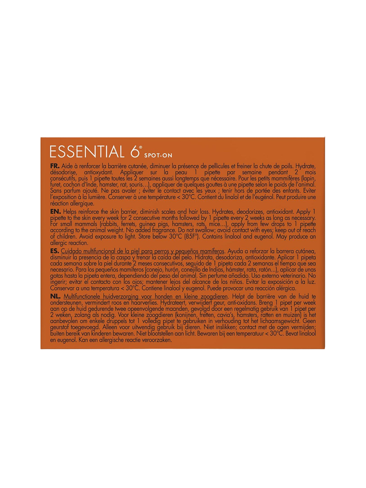 Действие Essential 6® основано на глубоком проникновении активных компонентов в эпидермис. Синергия 10 эфирных масел и незаменимых жирных кислот (Омега-3 и Омега-6) из масел семян конопли и нима восстанавливает гидролипидную пленку кожи. Средство оптимизирует работу сальных желез, что позволяет эффективно бороться как с сухостью и перхотью, так и с излишней жирностью шерсти, обеспечивая глубокое увлажнение.