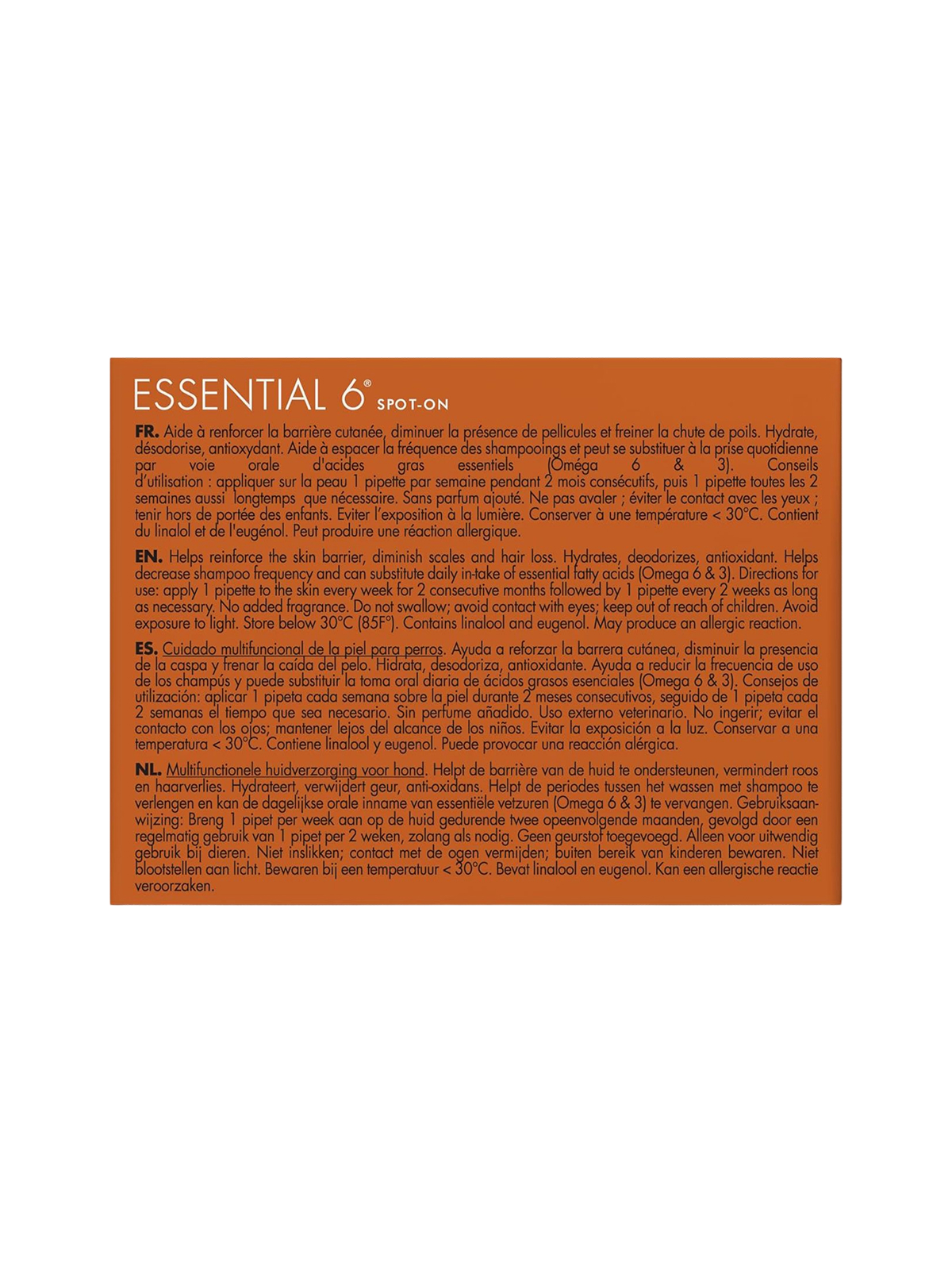 Действие Essential 6® основано на глубоком проникновении активных компонентов в эпидермис. Синергия 10 эфирных масел и незаменимых жирных кислот (Омега-3 и Омега-6) из масел семян конопли и нима восстанавливает гидролипидную пленку кожи. Средство оптимизирует работу сальных желез, что позволяет эффективно бороться как с сухостью и перхотью, так и с излишней жирностью шерсти, обеспечивая глубокое увлажнение.