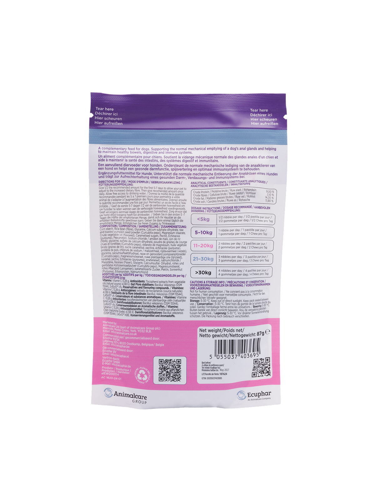 Профилактика и помощь при закупорке анальных желез, устранение симптомов зуда и «езды на попе», нормализация стула и поддержка здоровья желудочно-кишечного тракта у собак.