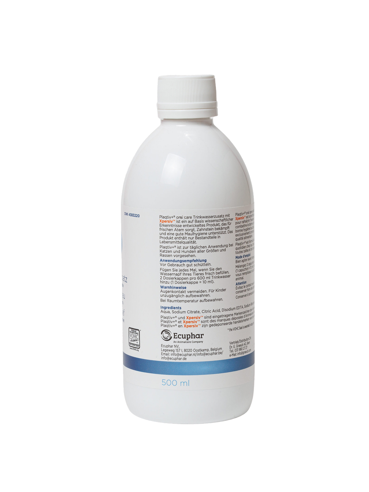Plaqtiv+ — добавка в питьевую воду для собак и кошек, предназначенная для профилактики зубного камня. Средство уменьшает образование налета и зубного камня, связывая минералы, которые участвуют в их формировании на поверхности зубов.