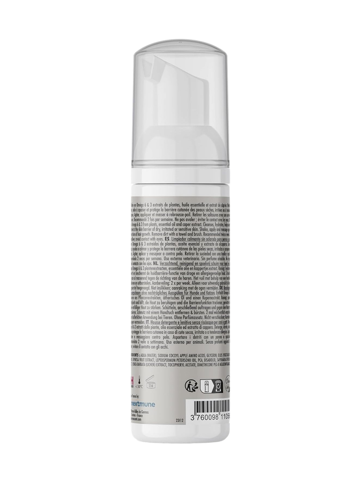 Состав: вода, ПАВ на основе аминокислот зелёного яблока, глицерин, растительное масло (богатое омега‑3 и омега‑6), экстракт плодов каперсов, эфирное масло лимонного чайного дерева, пирролидонкарбоновая кислота (PCA), бисаболол, экстракт корня сапонарии, экстракт лишайника (Usnea barbata), витамин E (ацетат токоферола), смягчающий компонент на основе масла луговых трав (Dimethicone PEG‑8 Meadowfoamate), консервант (гидроксиметилглицинат натрия).