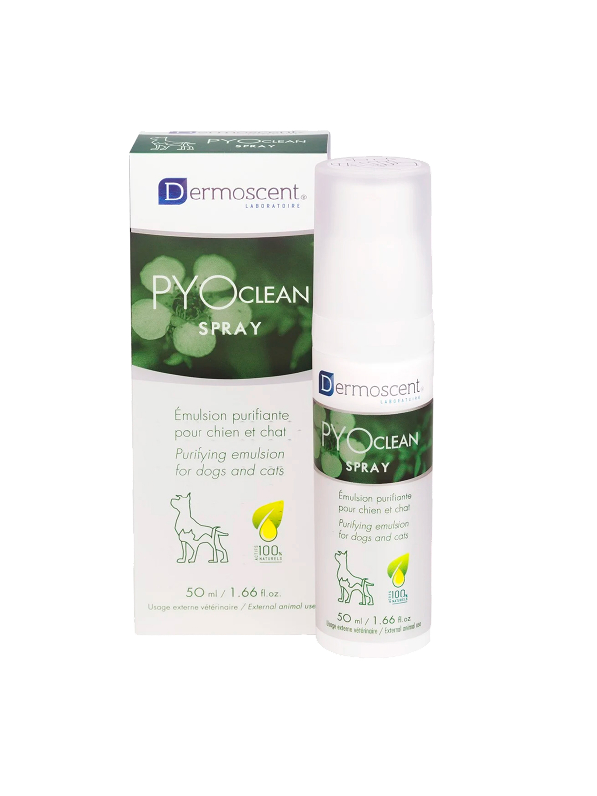 Dermoscent PYOclean Spray (Дермосент Пиоклин Спрей) — очищающий спрей для контроля кожных инфекций у кошек и собак, средство для ухода за кожей животных, страдающих кожными инфекциями. Спрей содержит природные активные ингредиенты с антимикробными свойствами, он восстанавливает естественный баланс флоры, одновременно стимулируя естественные защитные механизмы и успокаивая кожу.